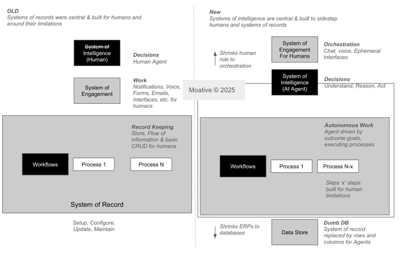 With AI, the tacit knowledge gain, process compression, and process representation & automation through AI agent workflows all happen within one intelligent system. Unlike ERP, this intelligent system is purpose-built. So the ERP (the system of record) simply becomes a data store. The human specialist from the shared services departments that used the ERP, simply becomes an orchestrator. The system of intelligence makes ERP a data store, and the human an orchestrator.