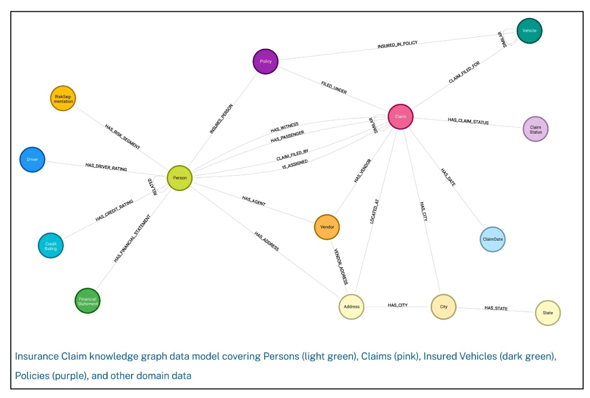 - Entities: People, vendors, claims (think of an insurance KG)